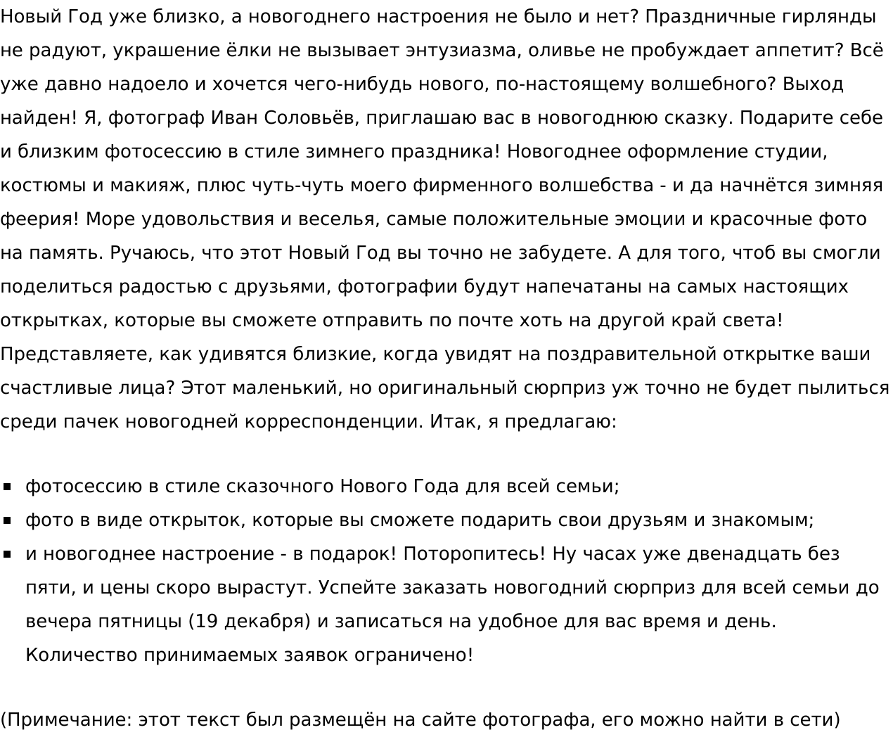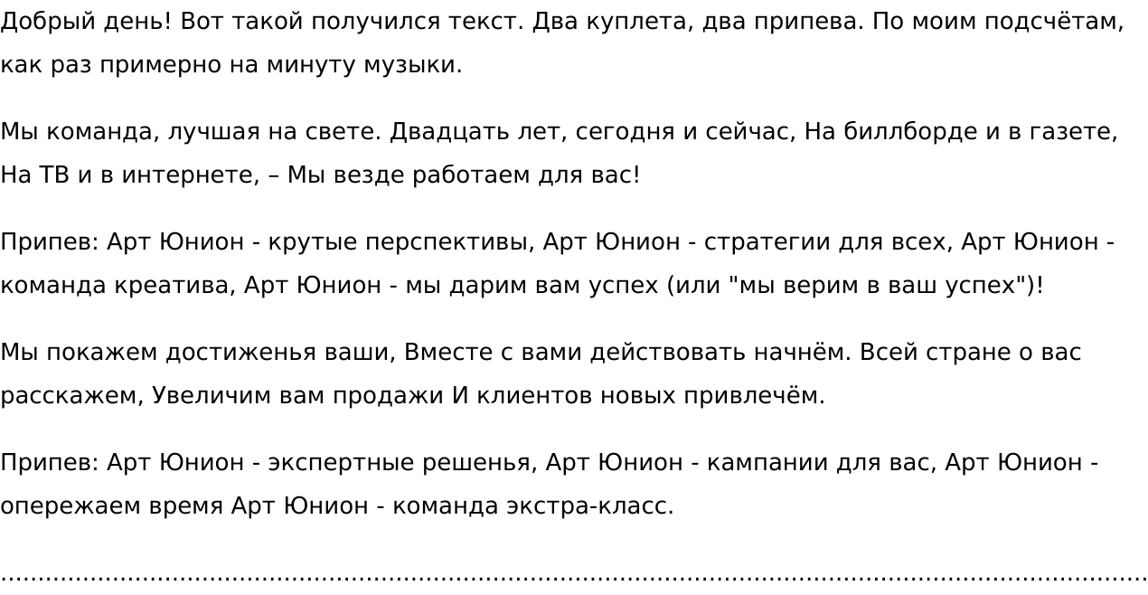 Вы дочитали этот текст до конца? Ура, это ещё один плюс: мои тексты не бросают недочитанными! Впрочем, я не буду злоупотреблять вашим вниманием. У вас есть заказ, а я могу его выполнить. Так что обращайтесь, я жду)