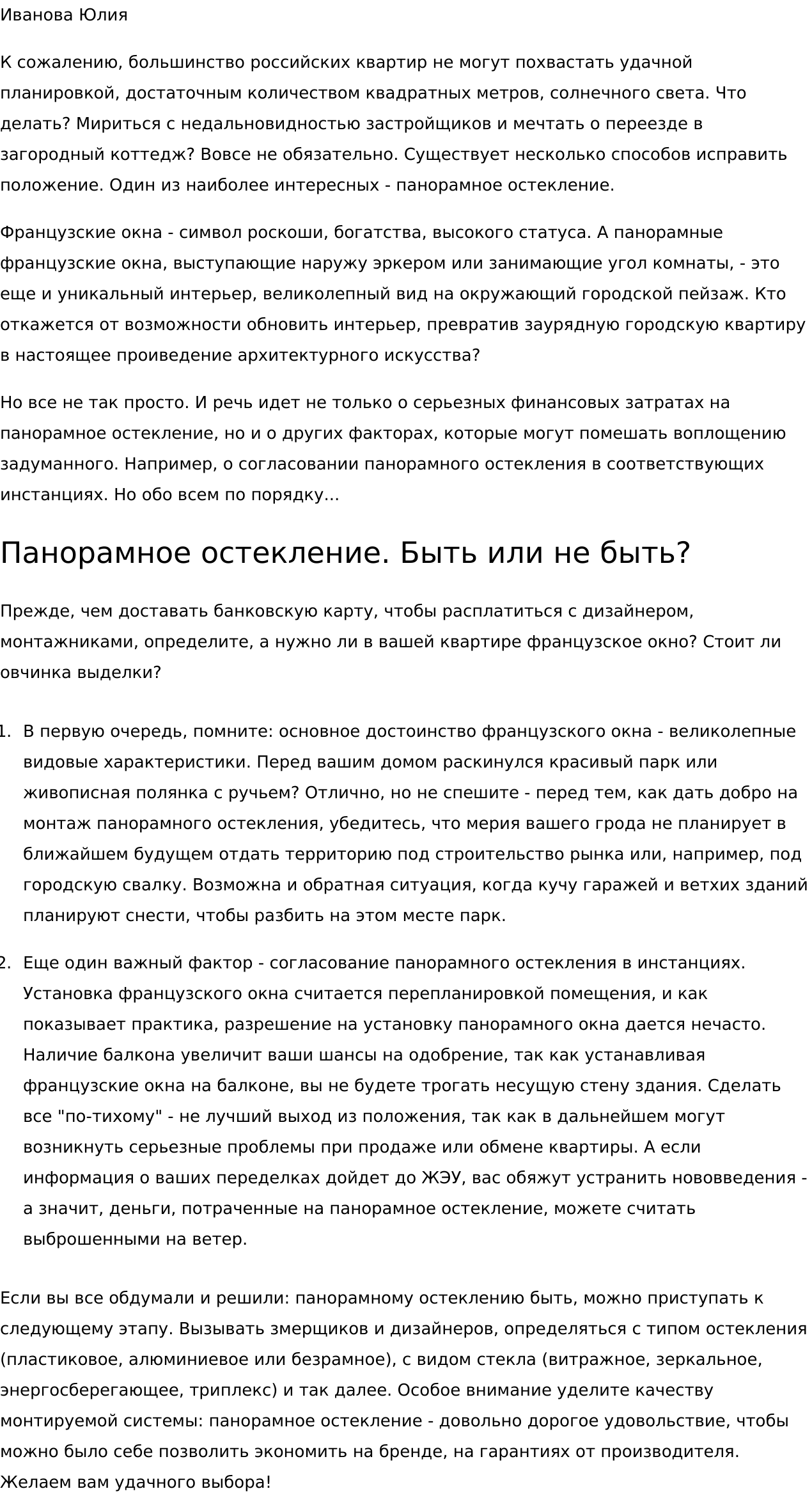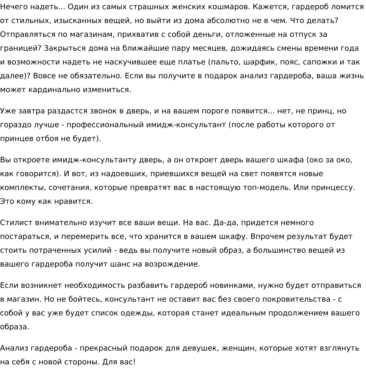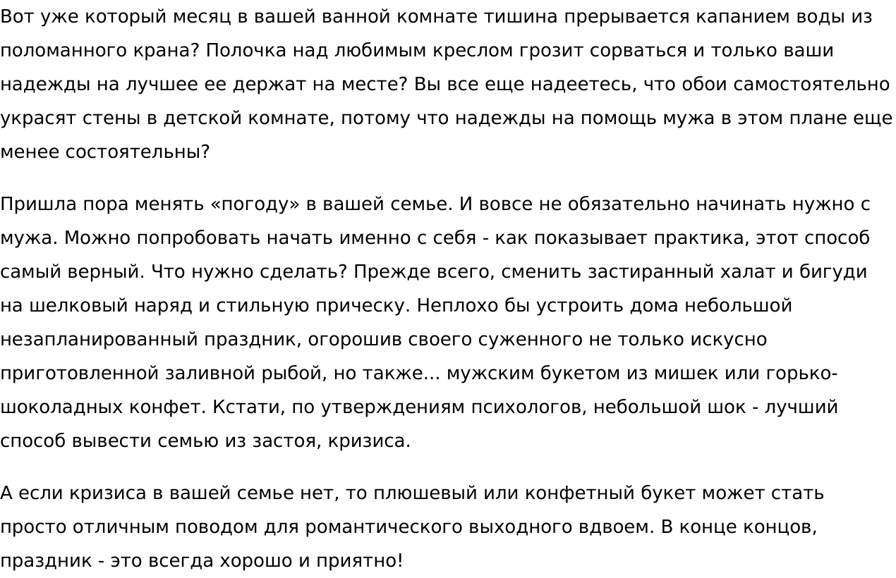 Счастлива, что занимаюсь любимым делом: собираю буквы в правильные слова, слова — в гармоничные предложения, предложения — в тексты, которые заставляют задуматься, прислушаться, улыбнуться... И остаться на вашем сайте надолго:)